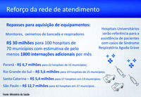 O montante vai permitir a compra ou locação de cerca de 450 ventiladores respiratórios e 555 monitores cardíacos para equipar leitos de cuidados intermediários ou intensivos. Além disso, deverão ser adquiridos 1,5 mil oxímetros para os estabelecimentos de primeiro atendimento e unidades 24 horas de pronto atendimento clínico e pediátrico. O equipamento é usado na classificação de risco do paciente com síndrome gripal.